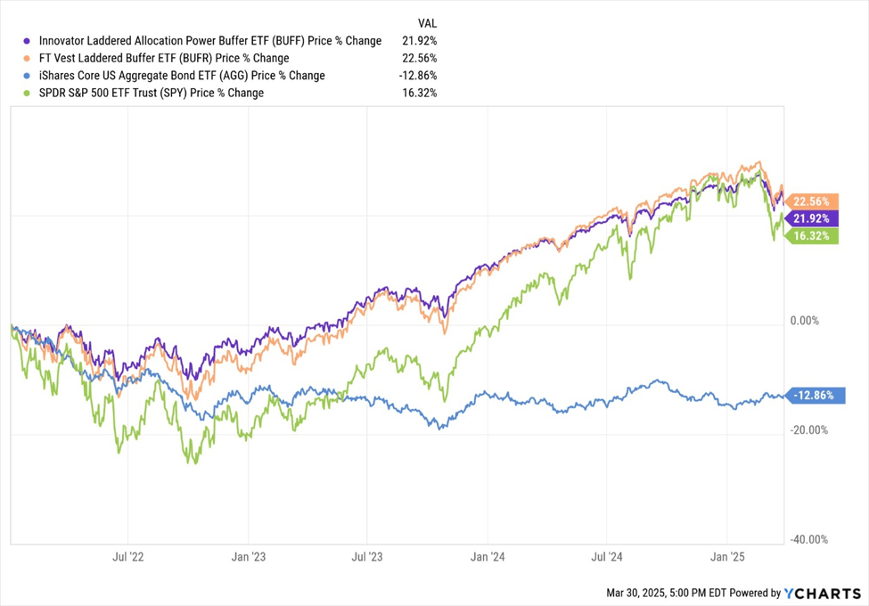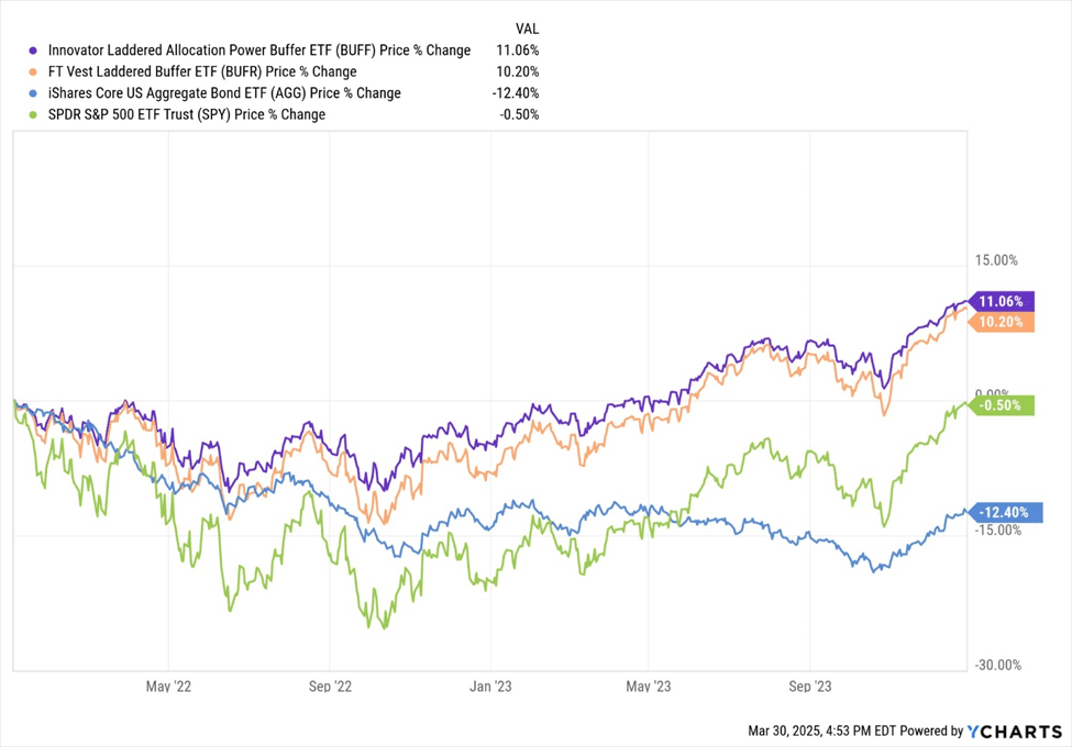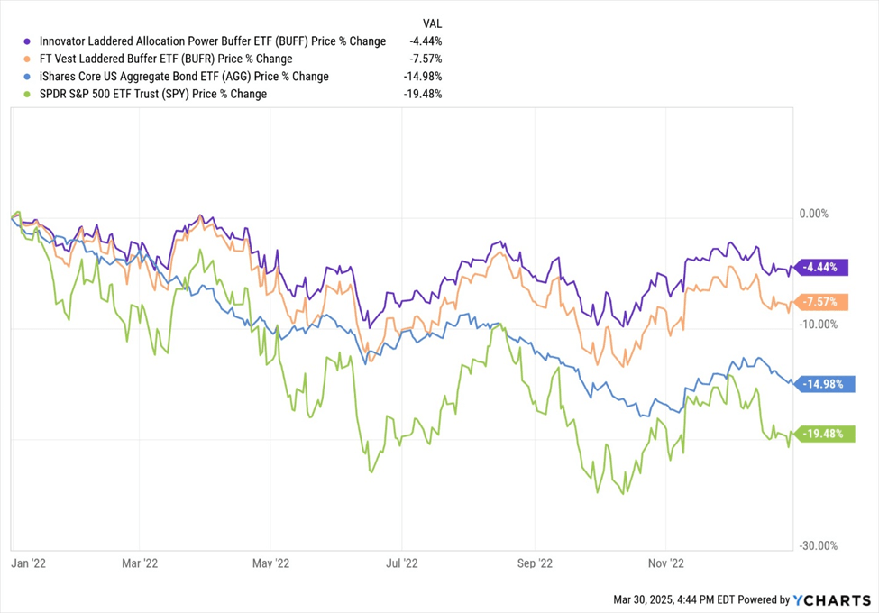 In 2022, a brutal year for equities with the S&P 500 (SPY) dropping 19.48%, laddered buffered ETFs like First Trust’s BUFR and Innovator’s BUFF shone. BUFF limited downside capture to about 25% (a -4.5% return), while BUFR captured 40% (-7.6%), far outperforming SPY’s unhedged loss. Even against a 60/40 portfolio (down roughly 17% in 2022), these ETFs delivered superior protection.