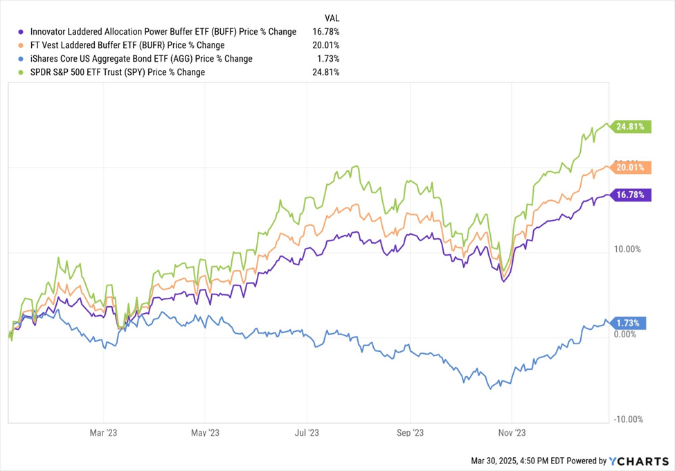 Because AQR attacks a misrepresentation, much of its analysis—comparing buffered ETFs to the S&P 500 or a passive equity/T-bill mix—misses the mark. Of course, these ETFs haven’t outperformed the S&P 500 over the past five years; they’re not meant to. The market’s been on a tear, and buffered ETFs deliberately sacrifice some upside for protection against severe drawdowns—think October 1987, 2000-2003, or 2008-2009. Since most buffered ETFs are relatively new, let’s test AQR’s thesis against recent history: the volatile 2022-2023 period.