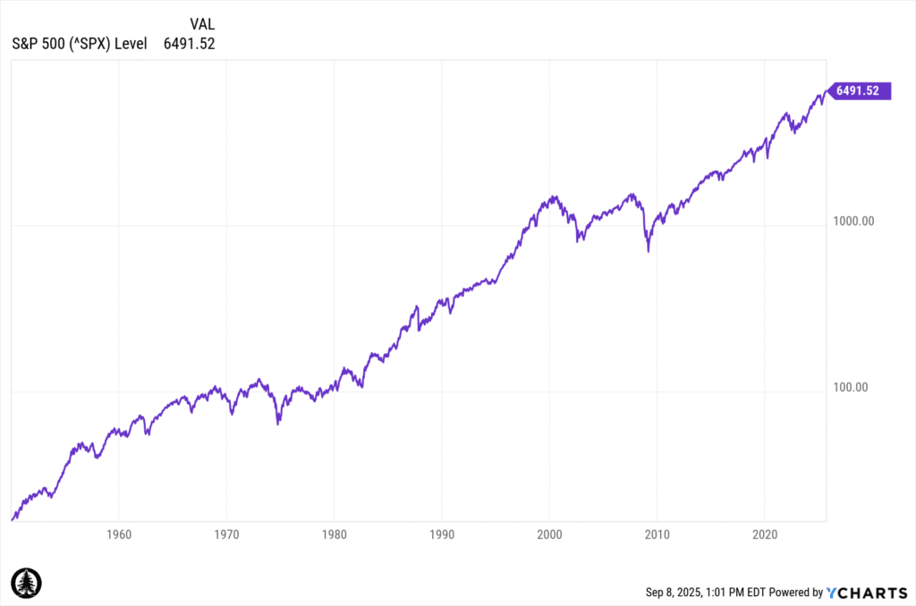 Below is a daily logarithmic return chart for the S&P 500 Index starting in 1950 and through Friday, September 5th, 2025.