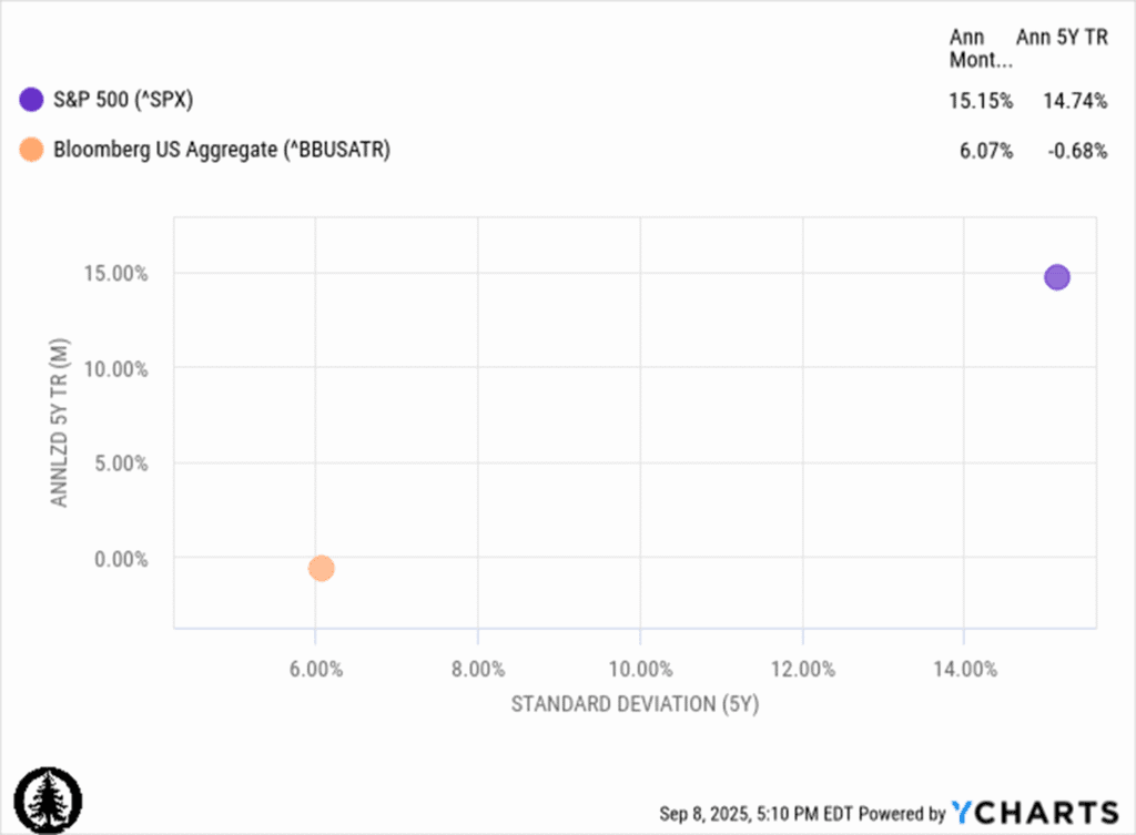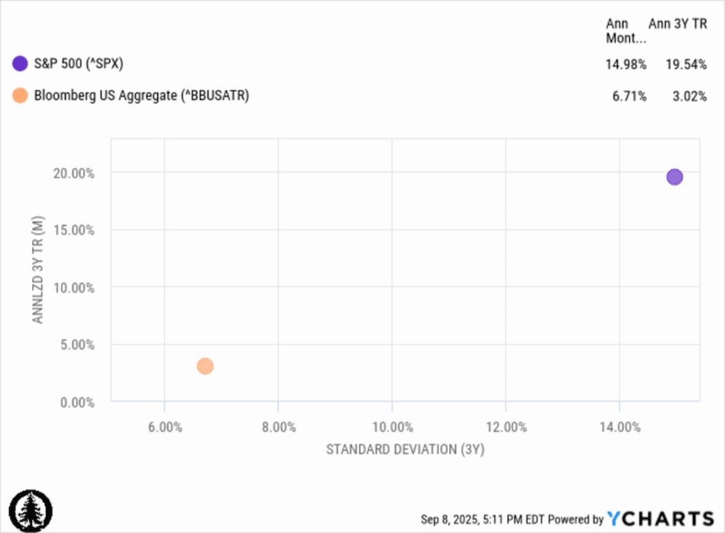 In comparing the five-year risk/return plots in the top panel above to the three-year risk/return panel on the bottom we can see the returns in both cases are well above the long term expected return of 10%. Over the past three years the annual return has been double the long-term average! This is a lot.