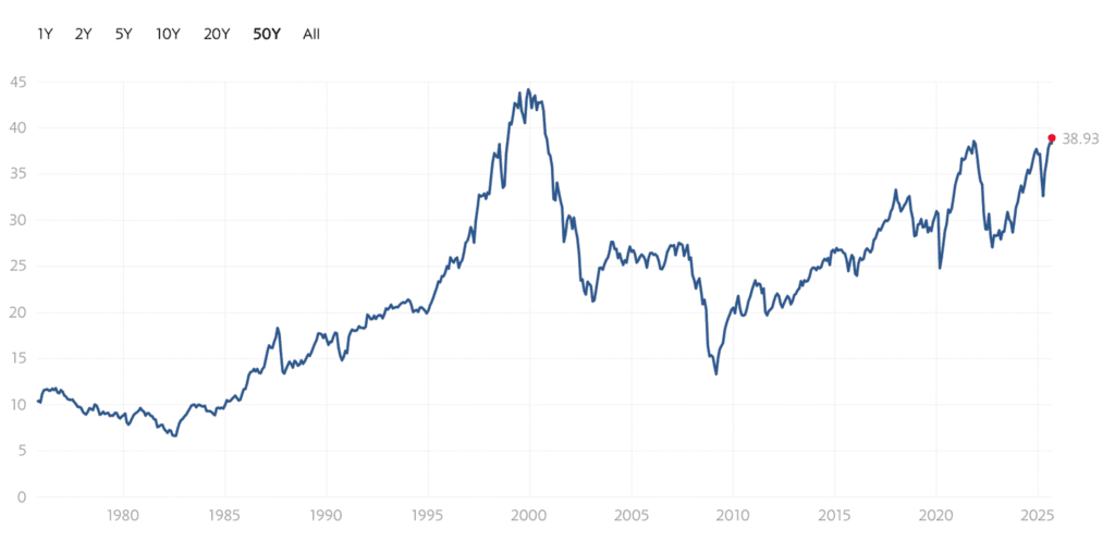 Finally, let’s examine the current valuations of the market relative to the long-term average. Below is the long-term chart of the Shiller CAPE ratio. The CAPE ratio after this three year rally now stands above where it stood prior to the 2022 correction. The only time in the entire history of the CAPE ratio (which goes back to the 1880s) to exceed the current was the period leading up to the “dot com” bubble of 2000. We are about five points away from that high now.